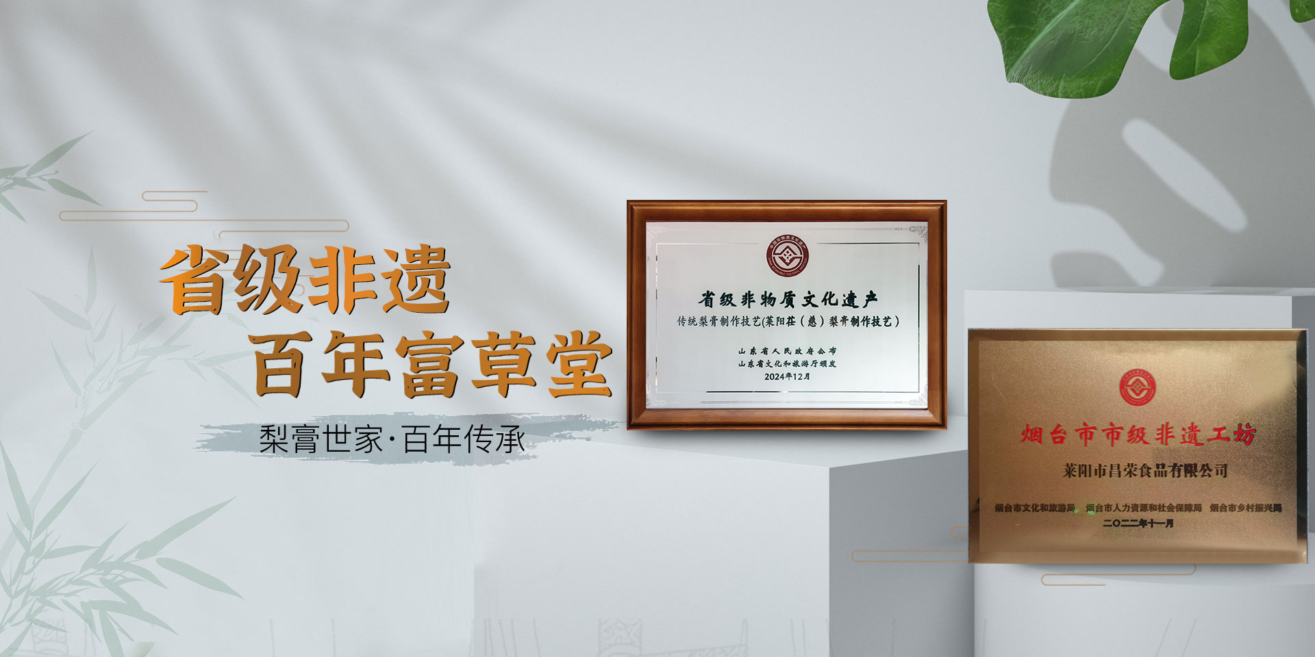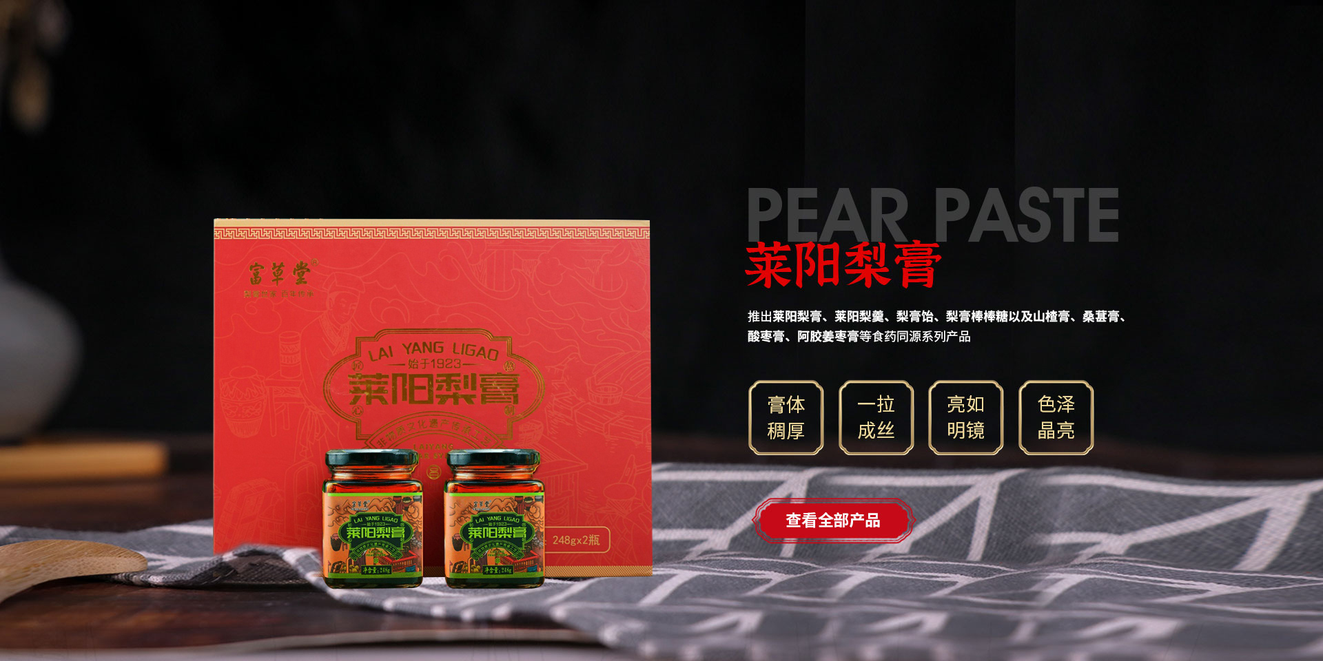 萊陽市昌榮食品有限公司成立于2003年,占地面積2萬余平方米,自有萊陽梨種植基地800余畝,年加工能力50萬噸,是一家集基地種植、原料倉儲、科技研發、生產加工、市場營銷、文化旅游為一體的集團化公司。 公司的“富草堂”品牌,源于1923年創辦的“富草堂大藥房”,距今已有百年歷史......